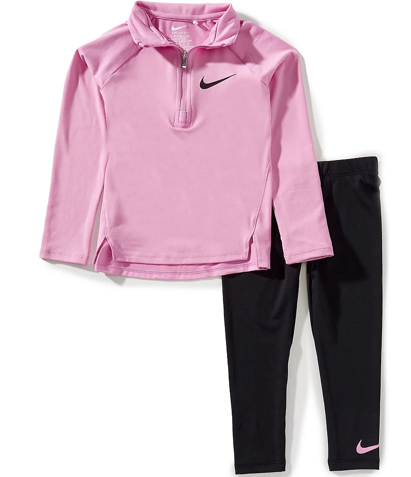 From Nike, this two-piece set features: Pullover: Solid pullover Mock neckline Long sleeves Partial-zippered front Nike "Swoosh" design trademark on the chest Moisture-wicking Dri-FIT technology Leggings: Coordinating bottoms Pull-on styling Elastic waistband Nike "Swoosh" design trademark on one leg Care: Polyester/elastane Machine wash/tumble dry Imported.