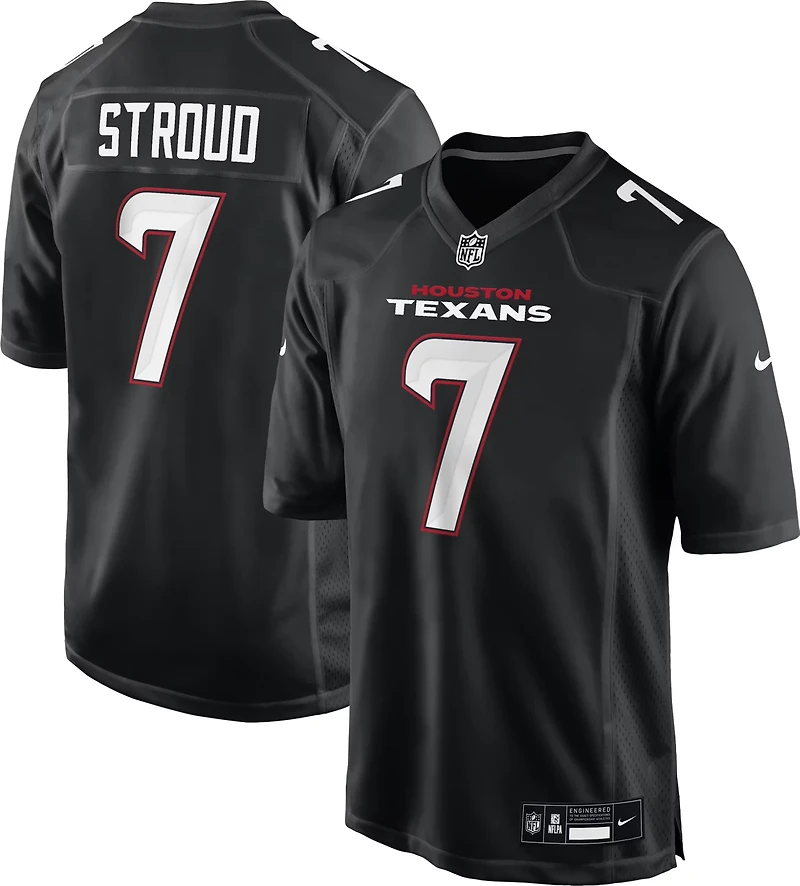 Show your Houston Texans pride with the Nike Men's Houston Texans Carbon Black Fashion N&N C.J. Stroud Jersey. Featuring a bold all-black design with striking red highlights, this jersey proudly showcases Stroud’s number on both the front and back. Crafted with lightweight, breathable fabric and authentic Nike detailing, it’s perfect for game-day excitement—whether you're at the stadium or supporting your team from home.