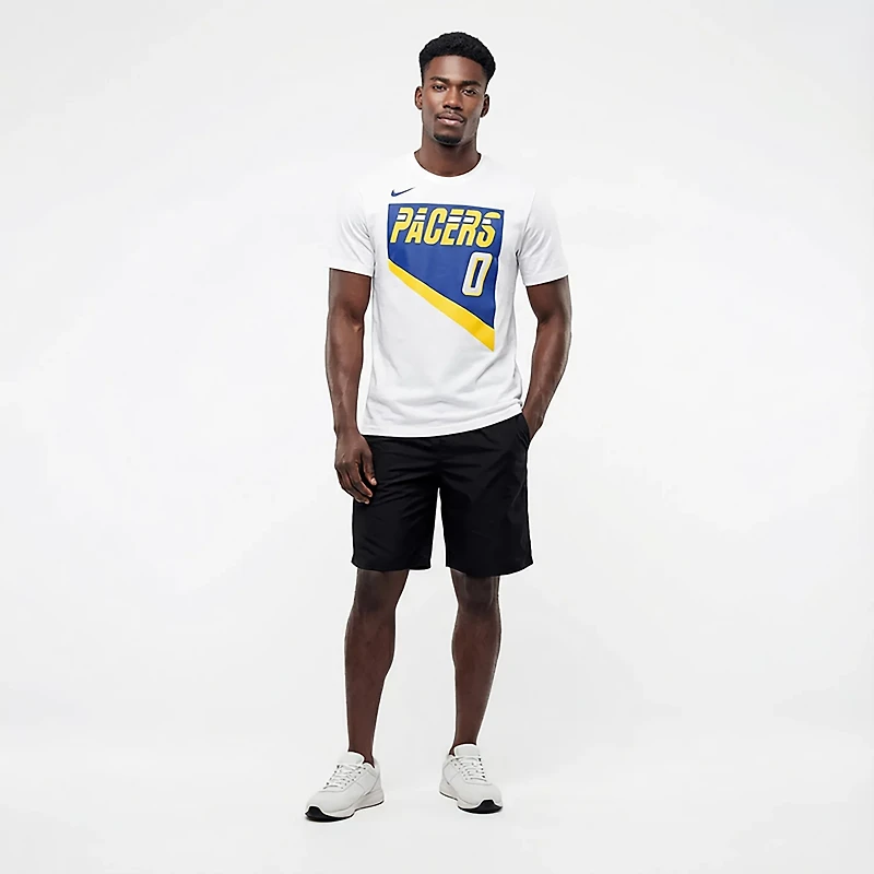 Rep your favorite player with the Nike Men's Indiana Pacers Tyrese Haliburton #0 Essentials City Edition T-shirt. The cotton material provides a comfortable feel, while the team graphics show off your Pacers pride.