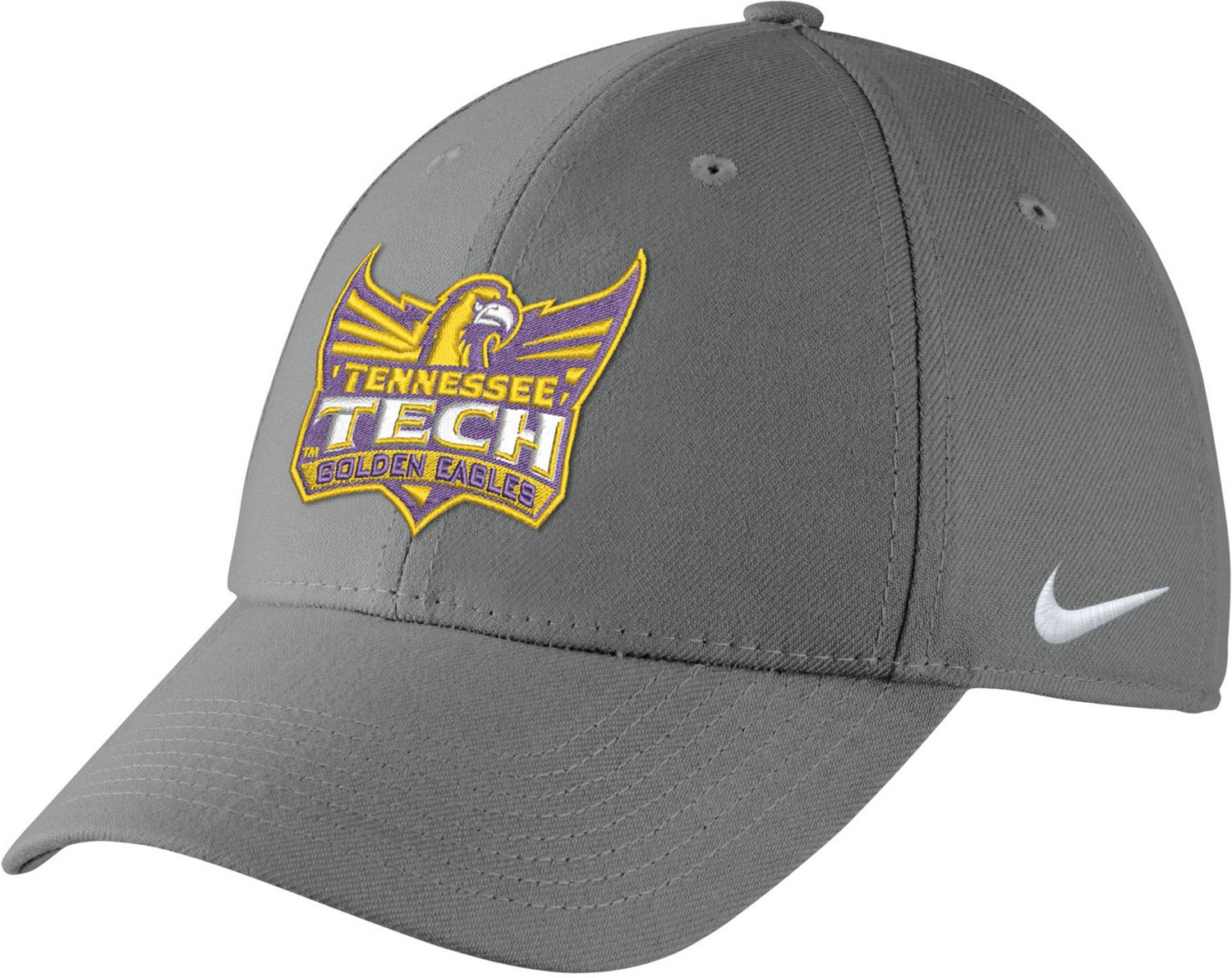 Show your Golden Eagles support with the Nike Men's Tennessee Tech University Swoosh Flex Cap. The 98% polyester and 2% spandex construction offers a long-lasting and stretchy feel, and the Dri-FIT technology helps keep you dry. The 2 embroidered team graphics make it clear you're a fan, and the Swoosh logo on the left panel shows your brand pride.