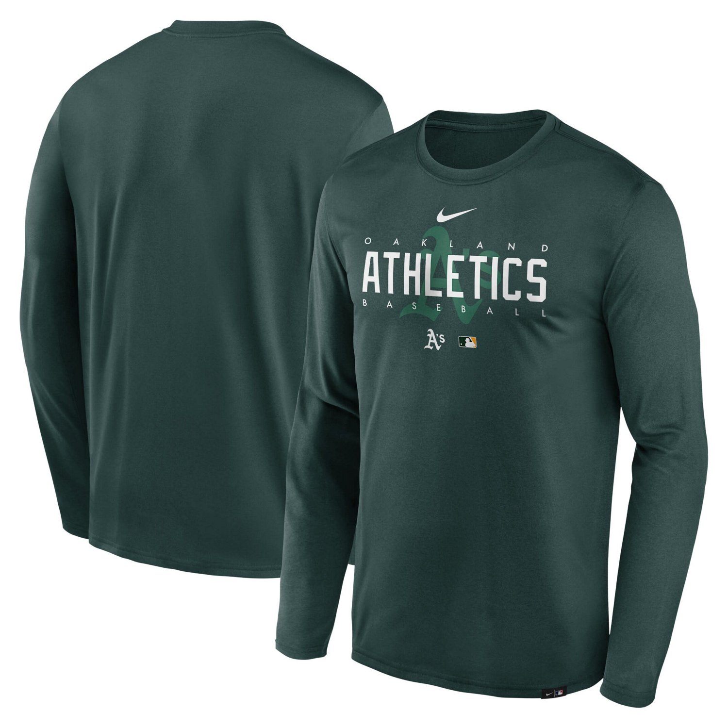 The Men's Nike Green Oakland Athletics Authentic Collection Team Logo Legend Performance Long Sleeve T-Shirt is the perfect way to show your support for the Oakland Athletics Made from breathable polyester with Dri-FIT technology this shirt will keep you cool and comfortable all game long The screen print graphics feature the iconic Oakland Athletics logo so you can show your team spirit with pride Whether you're cheering from the stands or just hanging out at home this shirt is a must-have for any Oakland Athletics fan