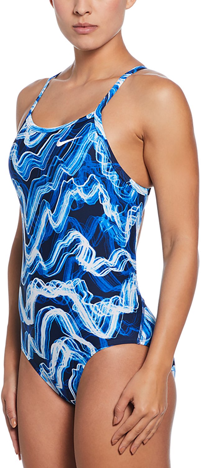 Swim laps around the competition in the Nike Women's Lightning Racerback Swimsuit. This stretchy one-piece is made of a lightweight polyester blend that won't weigh you down in the water. The scoop neck and patterned print help you stand out, while the high-cut leg helps you swim freely. The polyester liner and narrow straps keep you covered so that you can focus on your training.