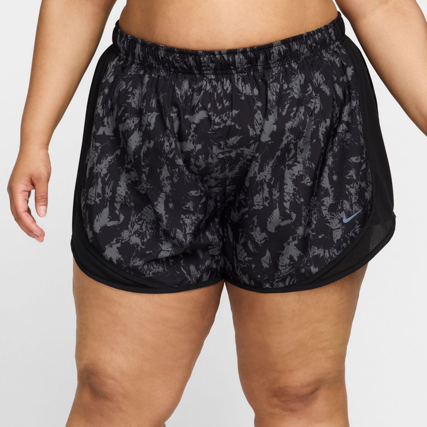 Stay cool while working out with the Nike Women's One Tempo Dri-FIT Printed Plus Size Running Shorts. The polyester material provides a soft feel, while the lining keeps you covered. Moisture-wicking technology helps keep you dry, and the mesh side panel provide ventilation. The elastic waistband stays in place, and the adjustable drawstring provides a custom and comfortable fit.