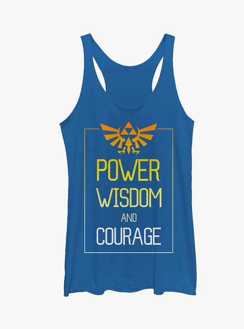 Become a hero of Hyrule with the Nintendo Legend of Zelda Power Wisdom Courage Heather Royal Blue Racerback Tank Top! An ombre-style print that reads "Power Wisdom and Courage" below the Triforce fades from orange to white on the front of this awesome blue Legend of Zelda shirt. 50% Polyester, 25% Cotton, 25% Rayon. Designed with raw-edge hems.