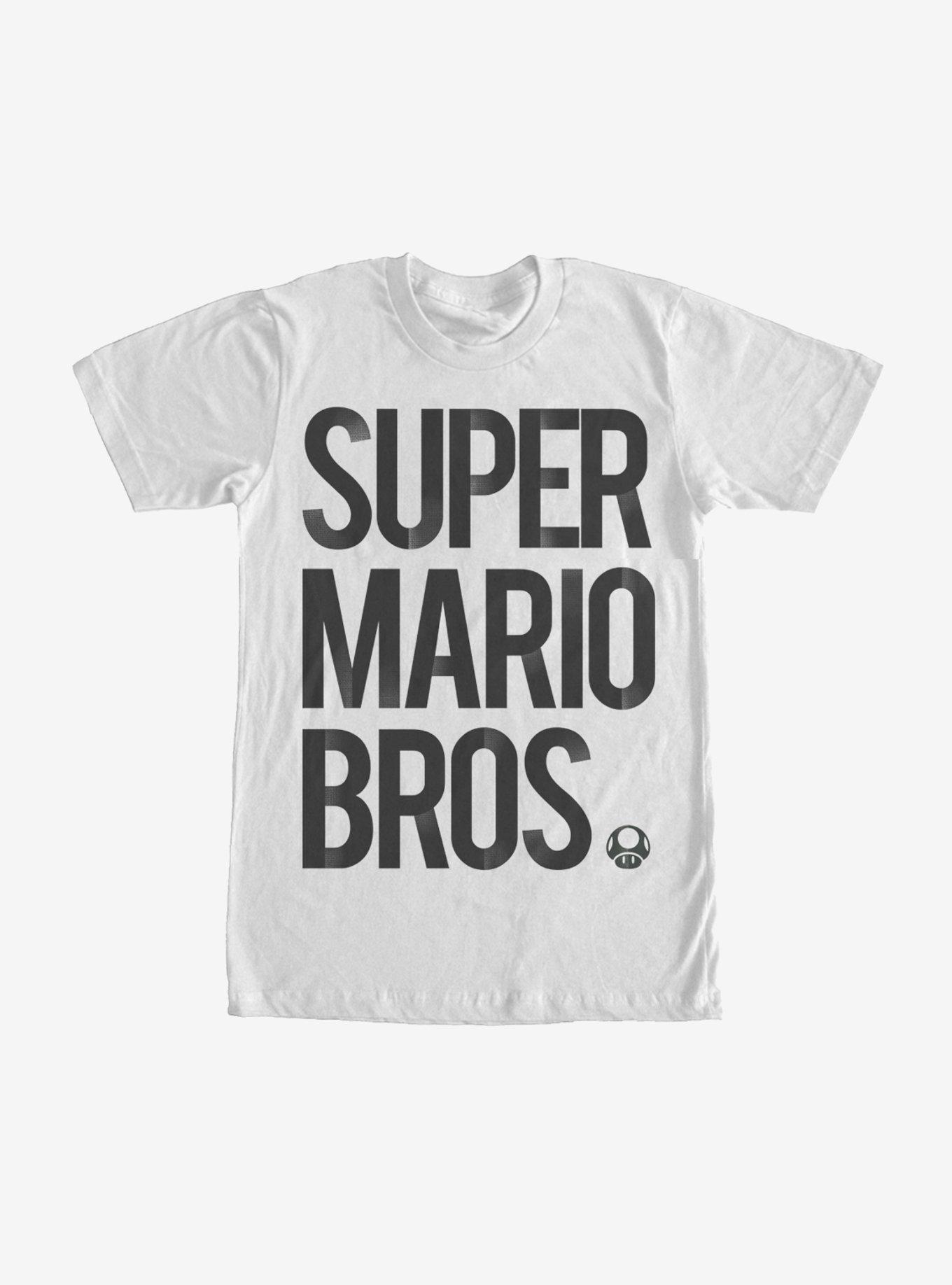 Get ready to take on Bowser and save Princess Peach with the Nintendo Super Mario Bros White T-Shirt! Bold black letters printed on the front of this awesome white Nintendo shirt spell out "Super Mario Bros" next to a small 1-Up mushroom. 100% Cotton.