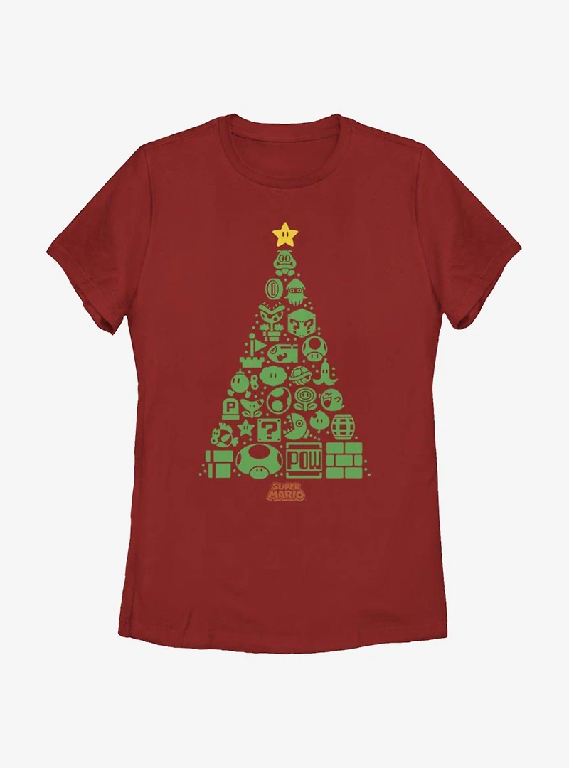 Nintendo Super Mario Christmas Tree Icons Womens T-Shirt in Chattanooga, TN