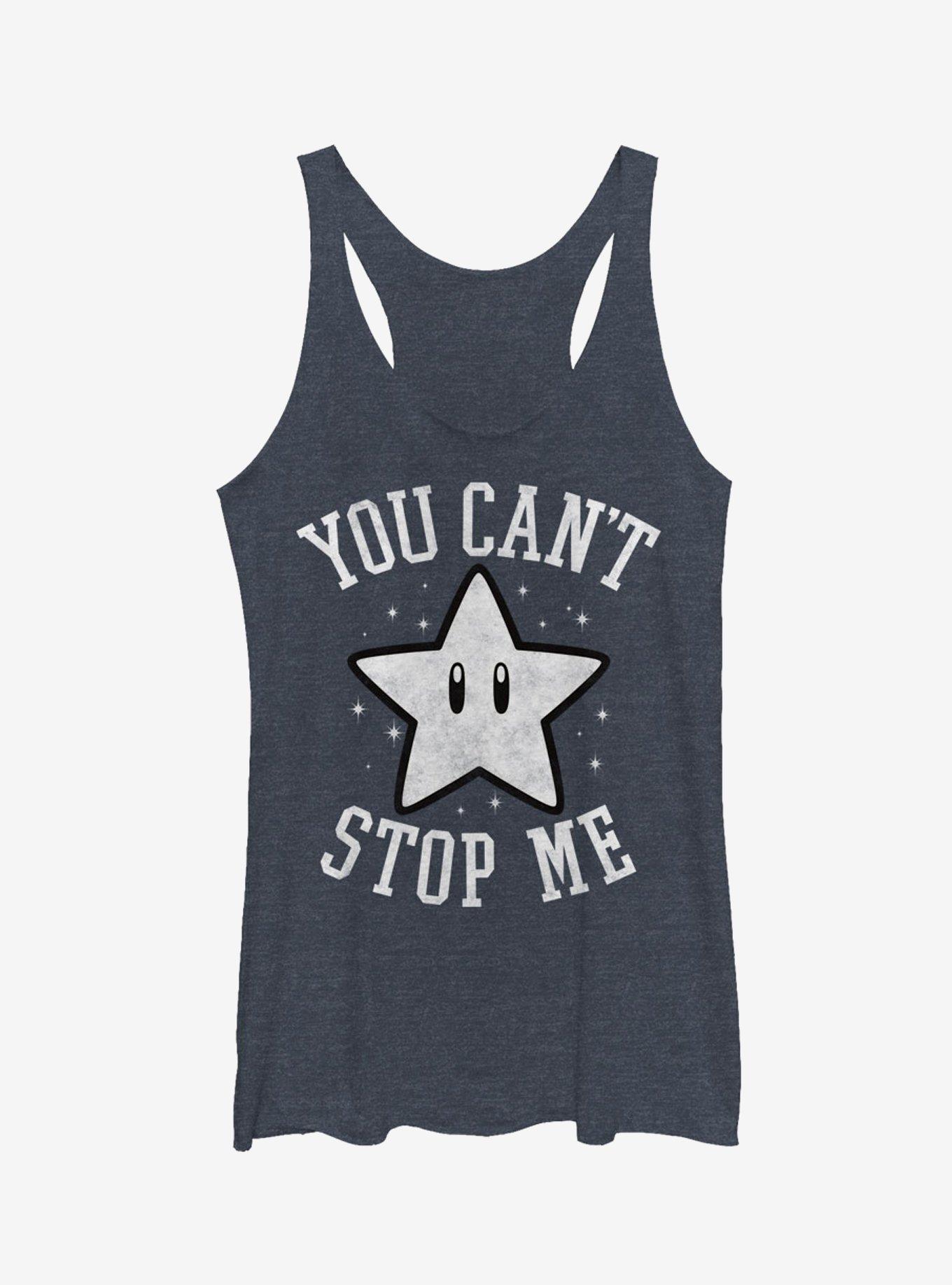 The Nintendo Super Star You Can't Stop Me Heather Navy Blue Racerback Tank Top is here to spread positivity! A Super Star straight from Mushroom Kingdom is printed next to "You Can't Stop Me" in a slightly distressed print on the front of this cute navy blue Nintendo tank top. 50% Polyester, 25% Cotton, 25% Rayon. Designed with raw-edge hems.