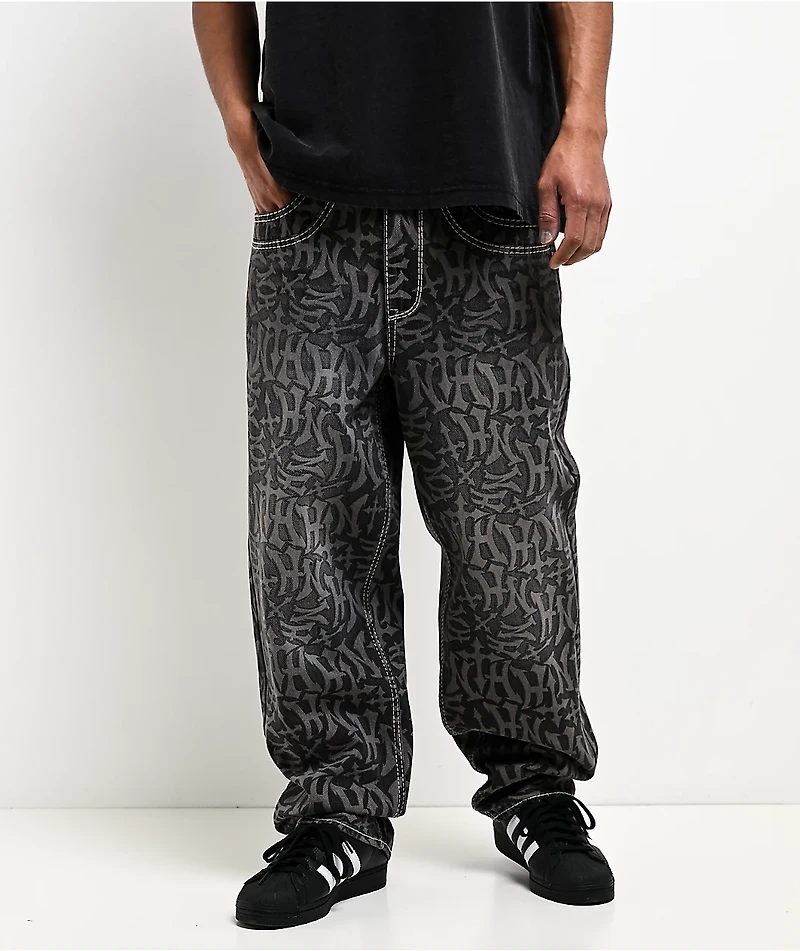 Decorated throughout with a printed graffiti-style logo pattern, Ninth Hall welcomes the Ambush Marked Up jeans in a washed black denim build to look authentically vintage. Framed by bold white contrast stitching all over, the waistline is accented b
