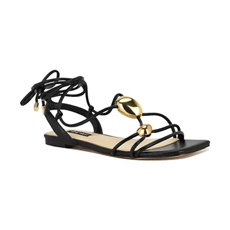 Fall in love with the Nine West Niraa flat sandal. A modern take on effortless elegance. Featuring a chic square toe, delicate wraparound ankle strap, and sleek strappy silhouette. Founded in 1978, Nine West empowers women to take on the world in style, from day to night. -Material: Faux Leather Tie closure Imported Product Specifications 0 in. M Material Faux Leather
