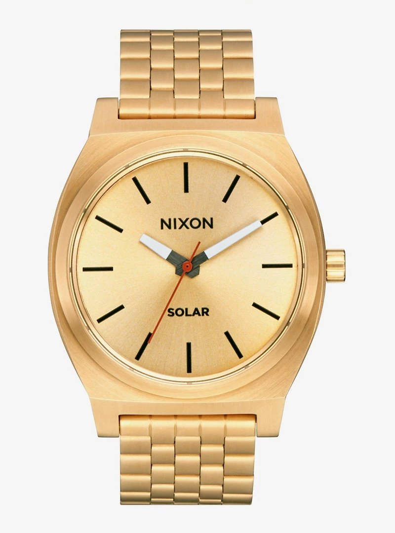 A true Nixon icon just got supercharged. Introducing the new Time Teller Solar. Built with the simple sophistication you know and love, the Time Teller Solar features a bigger case at 40mm, a new quick release 5-link bracelet with a deployment clasp that can be adjusted without a tool, and a 100m / 10 ATM waterproof rating. This watch is ready to make you look and feel good wherever you go. Item cannot be shipped to P.O. Boxes