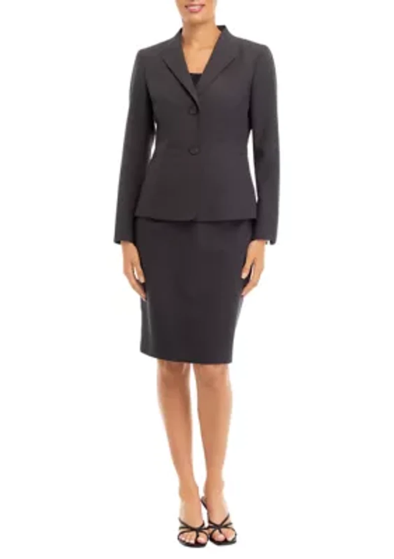 2-Button no collar jacket with shoulder padding. Lined slim skirt with no pockets and zipper at center back seam. Fabric content for both the blazer and skirt is 97% Polyester, 3% Elastane. The length of the skirt is 23.5-in. 2 Button closure Long sleeve Lined Imported Material & Care Polyester Dry clean only