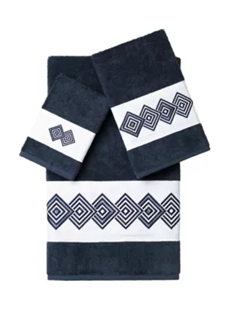 The Noah Embellished Towel Collection features an overlapping diamond motif on a textured woven border. These soft and luxurious towels are made of Genuine premium Turkish Cotton and offer lasting absorbency and superior durability. 3-Piece Embellished Set includes: 1 Bath Towel: 27 in x 54 in 1 Hand Towel: 16 in x 30 in 1 Washcloth: 13 in x 13 in Genuine Premium Turkish Cotton. Superbly absorbent and quick drying. Available in a range of lovely towel colors. Embellished in the USA. Made in Turkey. 3-piece set Warranty available Imported Material & Care Cotton Machine washable