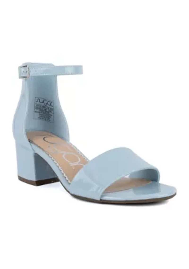 These stunning dress sandals from Sugar are propped up on low block heels. Buckle closure Open toe Padded insole Imported Product Specifications 2" heel Medium width Medium width Material Polyurethane, TPR Faux suede