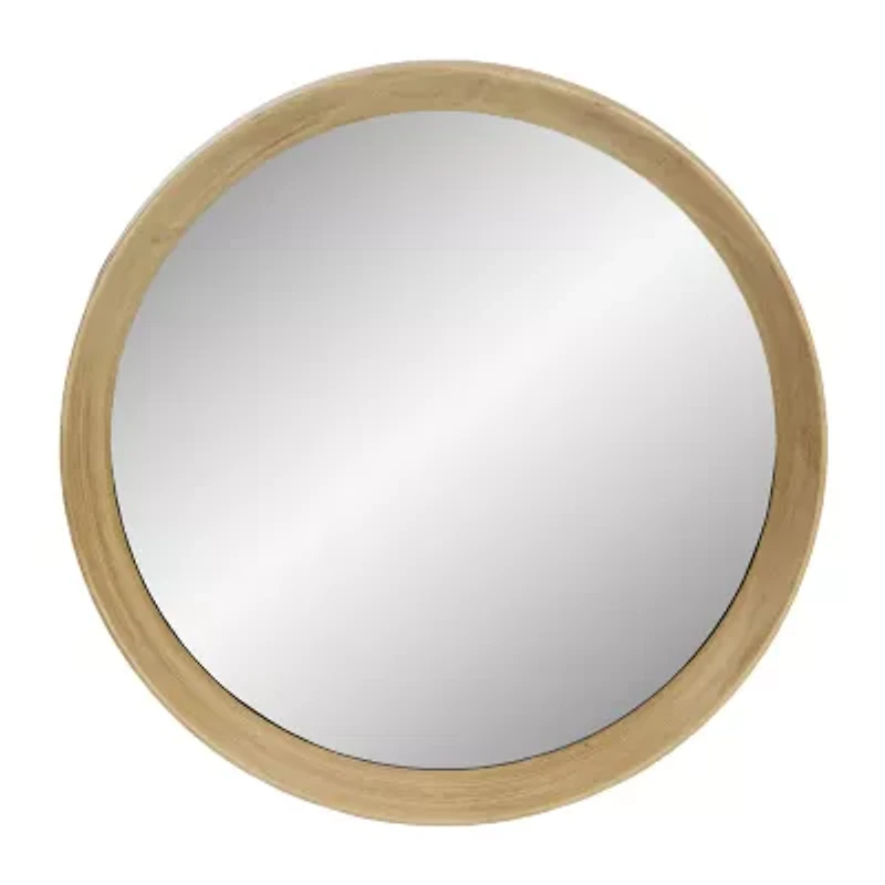 Brighten your space with this modern round accent mirror. The gleaming glass mirror features a plastic surrounding with a wood finish a round edge for a brilliant reflection. Fully functional and stylish you can add this to any empty wall space in your home. Features: round hanging wall mirror. Light woodgrain finish. Cardboard paper backing. For indoor use only. Dimensions: 13"l x 1"w x 13"h. Materials: plastic/glass