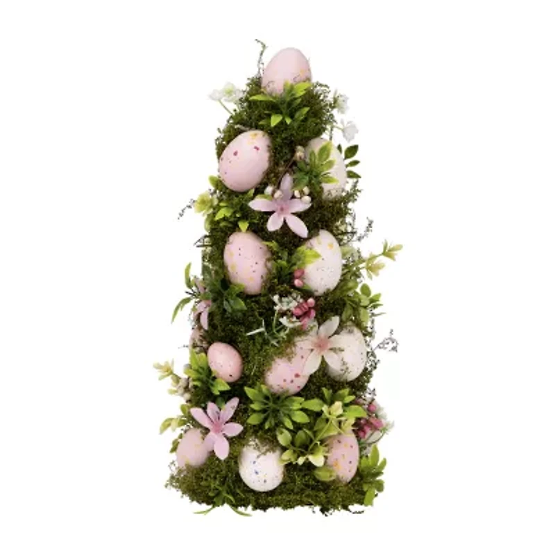 This wonderful egg tree is a must-have for the Easter holiday. The speckled Easter eggs are designed in shades of pink, white, and yellow. The tree is full of luscious green foliage with delicate flowers and floral buds throughout to welcome the spring season. Display on tabletops and mantles for a breath of fresh air to your interior decorating. Product Features: Easter egg tree, Pink, white, and yellow-speckled eggs, Accented with flowers and greenery, Tree is fully dimensional, Sturdy flat base for placement, Recommended for indoor only, Dimensions: 14" high x 7" diameter, Material(s): foam/plastic/polyester.