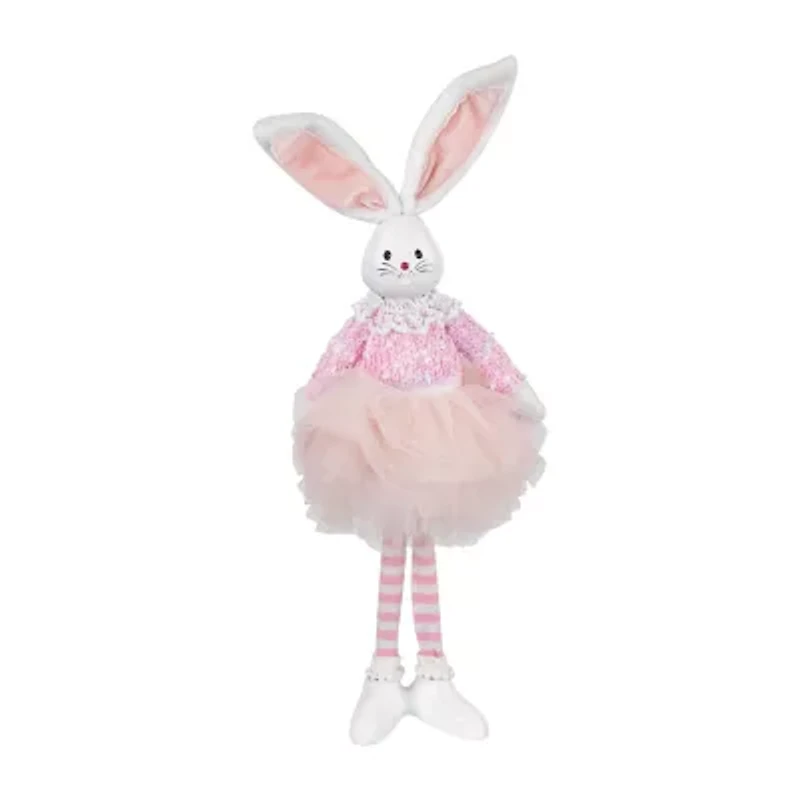 This standing ballerina rabbit decoration will provide grace and charm to your Easter celebrations. Adorned in a mesmerizing ensemble she wears a dainty pink and white sweater embellished with delicate lace trim. Her dreamy pink tutu adds an extra touch of whimsy. Striped pink and white tights complement her enchanting outfit perfectly. This figure is perfect for Spring and Easter with her pink and white bunny ears. A great gift for the ballerina in your life. Features: Ballerina bunny rabbit Easter figure. Dressed in a pink tutu with a pink and white top. Striped pink and white tights white socks and shoes. Plush white and pink bunny ears. Perfect as part of your Easter and Spring display. An ideal present for any ballet enthusiast. Recommended for indoor decorative use only. Dimensions: 15"H X 5"W X 4"D. Material(s): fabric/plastic.