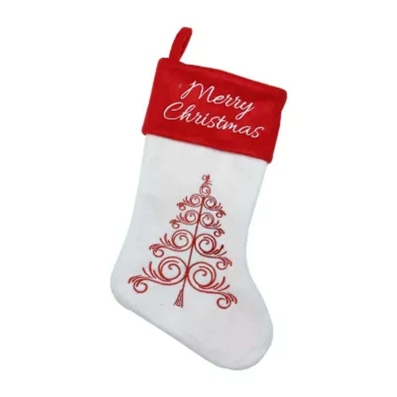 Christmas is all about fun glory and love! Decorate your seasonal decor with This fun-filled Christmas stocking the vibrant cuff that reads "merry Christmas" and with neatly embroidered tree design is ultimately eye-candy you could fill it with toys and goodies and hang it on to your trees or even on your stairways doorways or bedposts get the cutest reactions from your kids and create the best memories for them product features: white stocking with a red cuff accented with a white cuff that reads 'merry Christmas' in red embroidery comes ready-to-hang on a red fabric loop care instructions: spot clean only dimensions: 15.5"h x 15.5"w x 9.25"d material(s): polyester