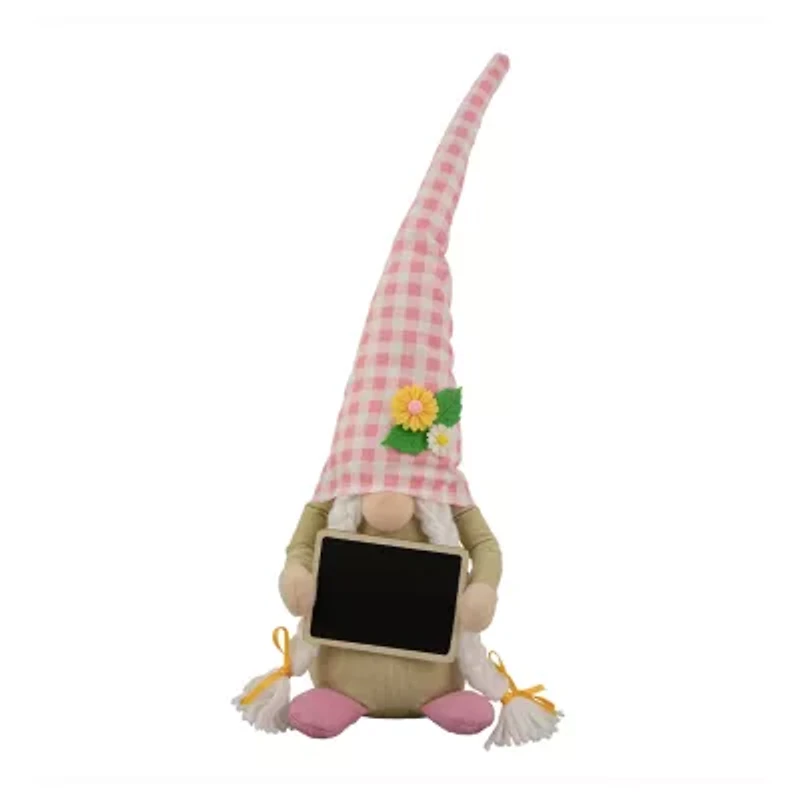 Gnomes are best known for guarding earthly treasures providing good luck and are perfect for protecting your goodies. This gnome is wearing a pink gingham hat with flowers and holds a chalkboard. Her large bulbous nose pokes out from her hat with long white braids. Place this gnome on your mantle or alone on any table for the perfect spring or easter decoration. Product features: pink gingham spring gnome. Gnome wears a pink gingham hat with flowers. Holds a chalkboard in her hands. She is wearing a tan sweater. Gnome has long white braids and bulbous nose. Weighted bottom keeps gnome steady. Recommended for indoor use.