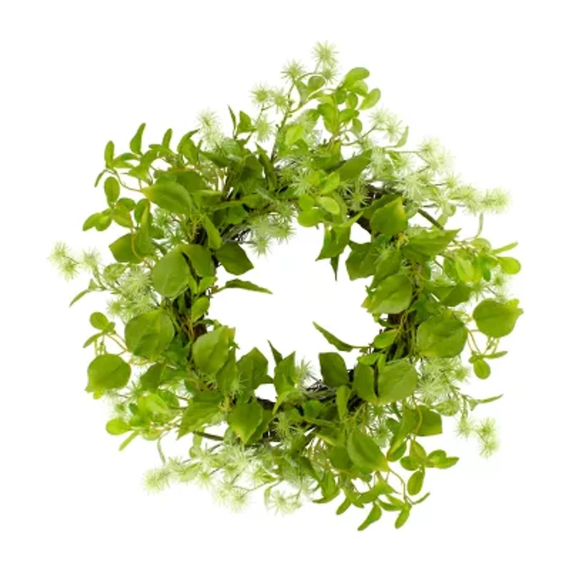 Add a touch of nature to your home with this jujube wreath. Featuring realistic green foliage intertwined with a natural grapevine base what better way to welcome guests and spring to your home. Features: green jujube floral spring wreath. Assorted green foliage completes this wreath. Natural twig grapevine backing for hanging. Recommended for indoor use only or covered outdoor use. No assembly required - wreath comes in 1 piece. Dimensions: 18" diameter (measured from outermost edge to outermost edge across the wreath). Material(s): polyester/twig/wire/plastic