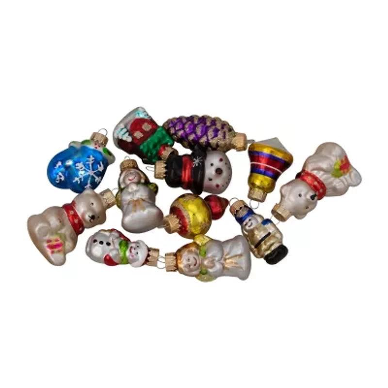 This festive mini figurine ornament set includes all your Christmas and winter must-haves. Various colors and gold accents add shimmering pops to your holiday decor. Allow these little characters to light up your celebrations in a unique way. Product features: 12-piece set. Color: silver gold red, white, green blue purple, yellow and black. Finish: matte and shiny. 2 silver and gold praying angels. 2 gold and red finials. 2 champagne gold teddy bears wearing a red scarf. 1 pair of blue gloves with white snowflakes. 1 red and green cabin with frosted bushes. 1 full body smiling snowman wearing a red and frosted hat. 1 snowman head wearing a black and red top hat. 1 purple and gold glitter pinecone. 1 gold and blue soldier. Ornaments are equipped with gold ornament caps. Recommended for indoor use only dimensions: large ornament: 2.25"h x 1.5"w x 1.5"d (bears). Small ornament: 1.75"h x 1"w x 1"d (full body snowman) material(s): /metal/glitter