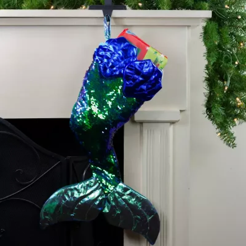 Do you love every think mermaid? Then this stocking is just what you need to complete your mermaid glam holiday decor green sequins flip to shiny black with a sweep of your fingers give your holiday the perfect amount of mermaid glitz with this impressive stocking! Product features: mermaid Christmas stocking green reversible sequin flips to black sequins features metallic blue seashells on top and blue iridescent tail at the bottom one-sided design with a green fleece backing each comes ready-to-hang on a blue iridescent loop recommended for indoor use only dimensions: 24"h x 13"w material(s): polyester