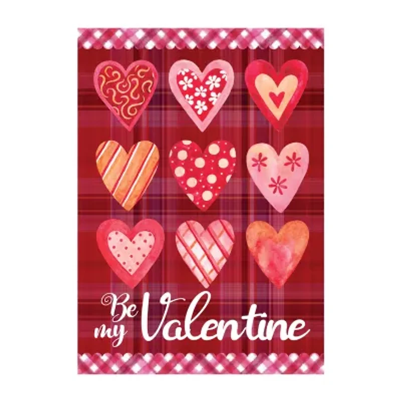 Show your love this Valentine's Day with these decorative hearts garden flag. It will add a pop of vibrant red color to your outside decor. Perfect to display year after year. Features: Valentine's Day house flag. Reads "Be My Valentine" on a red plaid background. Features multiple hearts with various designs. A soft high-quality fabric for durability. Sleeve on top allows the flag to slide onto the flagpole. Double-sided design. Care instructions: Handwash in cold water with mild soap. Hang dry. Use cool iron if needed. Dimensions: 40" long x 28" wide. Material(s): polyester. Note: Flagpole is not included