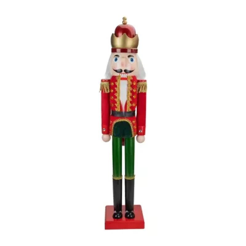 Nutcrackers are said to represent power and strength and serves like a trusty watchdog guarding your family against evil spirits and danger add a new twist to your holiday decor with This large royal nutcracker wearing a traditional red and gold uniform with jeweled accents This king is a unique but festive touch to your Christmas decor product features: Christmas king nutcracker figure white hair and beard compliments This nutcracker wears a red and green uniform with a red and gold crown accented with gems and gold trim stands on an attached sturdy red base lever on the back of the nutcracker to make his mouth open and close recommended for indoor decorative purposes only dimensions: 35.5"h x 8"w x 6.75"d material(s): wood/plastic/fabric/faux fur