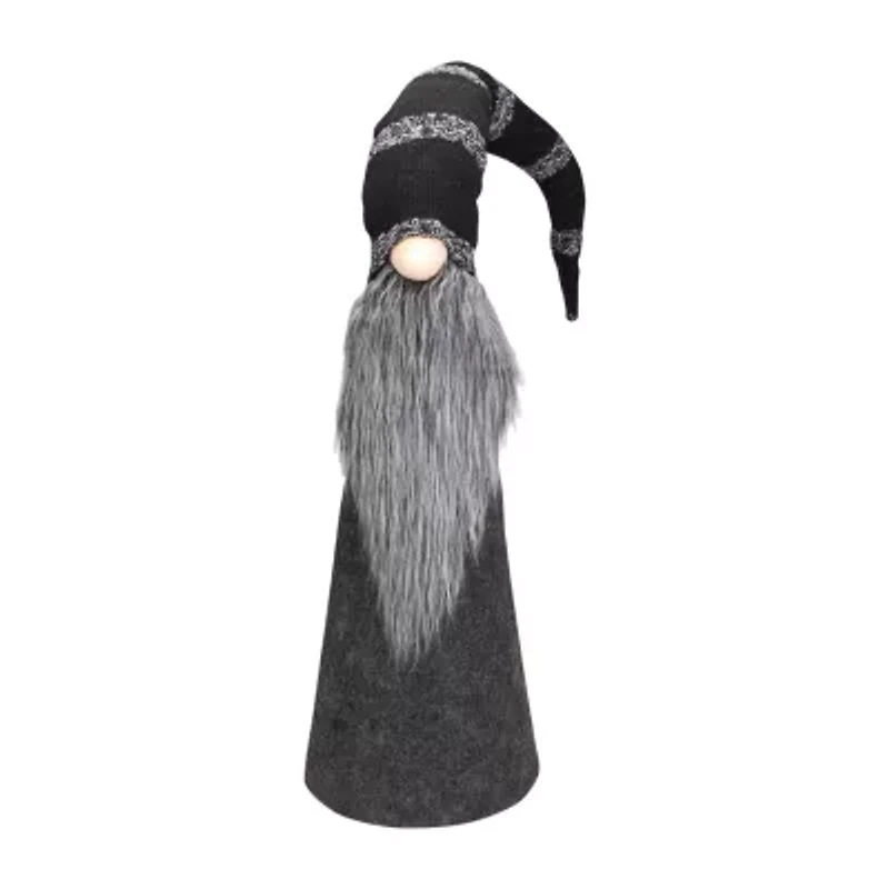 Add some mystical enchantment to your holiday decor with This charming Santa gnome the gnome is wearing a black and white knit pointed with bendable wire center allowing you to shape it as you desire he has a cone shaped gray felt body with a faux fur beard his nose is illuminated by a warm white led light perfect for accenting your entryway or mantel hearth features: gnome Santa Christmas decor features a nose that is illuminated by a warm white led lights the gnome is wearing a black and white knit winter hat winter hat is bendable and pointed at the top This gnome's body is gray features a long white beard and round nose shaped like a cone requires 2 button cell batteries - included convenient on/off switch located behind gnomes beard recommended for indoor use only dimensions: 37"h x 7.5"w x 7.5"d materials: plastic/polyester/faux fur