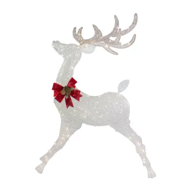 Light up your holiday with This unique reindeer decoration the metal body is wrapped in elastic strands creating a completely see through silhouette so the lights shine bright embellished with a glittery red bow and pine cone accent the perfect majestic statement for indoor or outdoor spaces product features: pre-lit with 120 clear lights "warm clear" also known as "warm white" has a soft natural glow similar to candlelight bulb size: micro - non replaceable led lights use 90% less energy cool to the touch lead wire: 16 feet - clear some assembly required; ground stakes and cable ties included ul approved and certified for indoor or outdoor use adapter: 4.5v/3.6w dimensions: 56"h x 38"w x 9"d material(s): metal/plastic/sisal