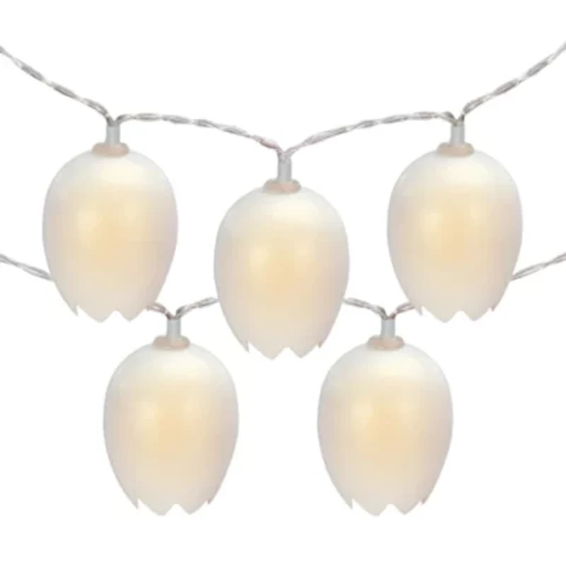 Decorate your home with these fun cracked Easter egg lights. The white eggs are cracked open and illuminated from the inside by warm white micro LED lights that sit upon discreet clear wire. Perfect for your Easter decorating needs! Product features: Color: warm white bulbs / clear wire. Cracked Easter egg light covers. Number of bulbs on string: 10. Bulb size: micro wide angle. Bulb type: LED. Spacing between each bulb: 6". Lighted length: 4.5'. Total length: 5.5'. 12" lead cord. Additional product features: LED lights use 90% less energy. Bulbs stay cool to the touch. For indoor use only. Requires (2) 'AA' size batteries - not included. Convenient on/off switch on the battery pack. Non-replaceable bulbs. Cannot connect multiple sets together. Easter egg dimensions: 2.25" high x 1.5" diameter. Material(s): plastic/wire.