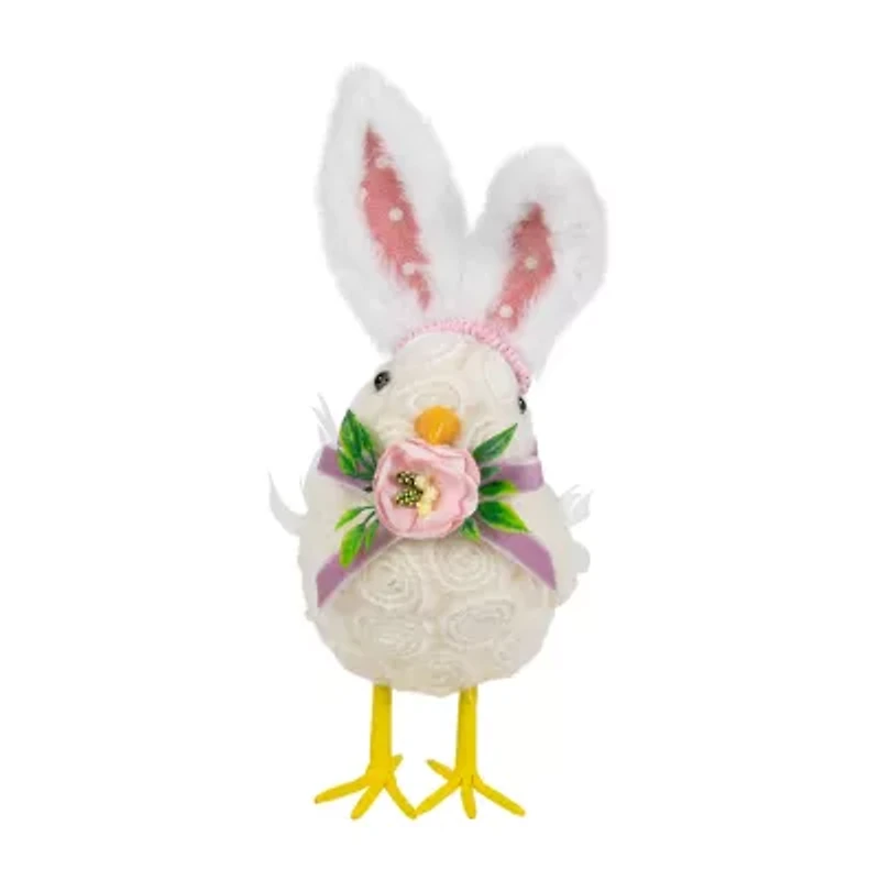 This whimsical and enchanting piece captures the essence of the season blending the cuteness of a chick with the charm of a bunny. A lively vibe to this classic Easter icon the white chick has a beautiful swirl pattern and wears white and pink rabbit ears. Also features a a purple bow with a pink flower to evoke the beauty of Easter and springtime. Display as a centerpiece on your Easter table as a delightful addition to your seasonal decor. Product Features: Easter chick with rabbit ears figurine. Wearing white fluffy polka dot ears. Adorned with a bow accented with a pink flower. Real feather accents on the wings and tail. Stable placement provided by broad feet. For indoor use only. Dimensions: 8.75�H x 3.5�W x 5�D. Material(s): plastic/foam/fabric.