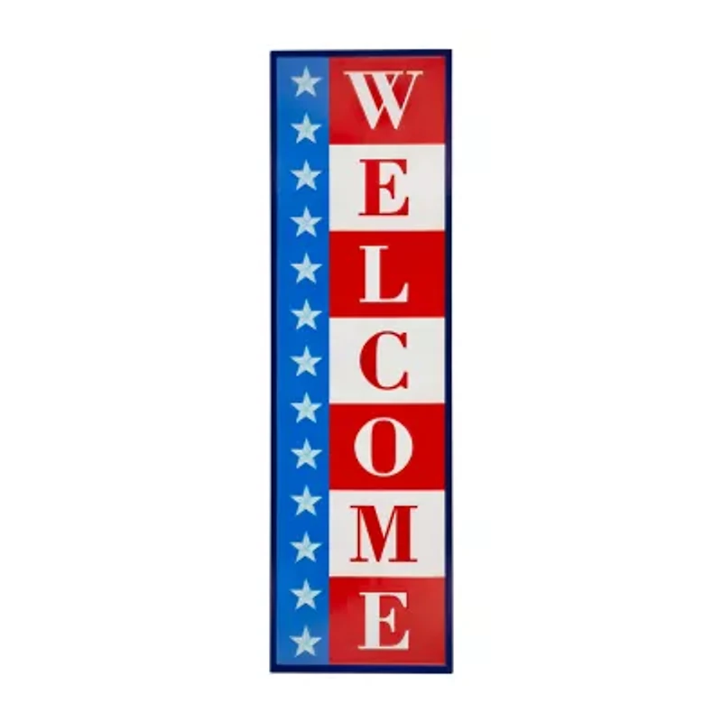 Welcome guests with a touch of classic americana charm with this metal porch board leaner! Adorned with an iconic red, white, and blue theme this sign adds a patriotic flair to any space. Perfect for any room in your home or can be display on your covered porch or patio. Product features: decorative patriotic porch leaner. Reads: welcome. Iconic red, white, and blue theme. Comes ready to hang with 2 keyhole hooks on the back or can be leaned against a wall. For indoor use or outdoor covered area. Dimensions: 40"h x 11.75"w x .5"d.