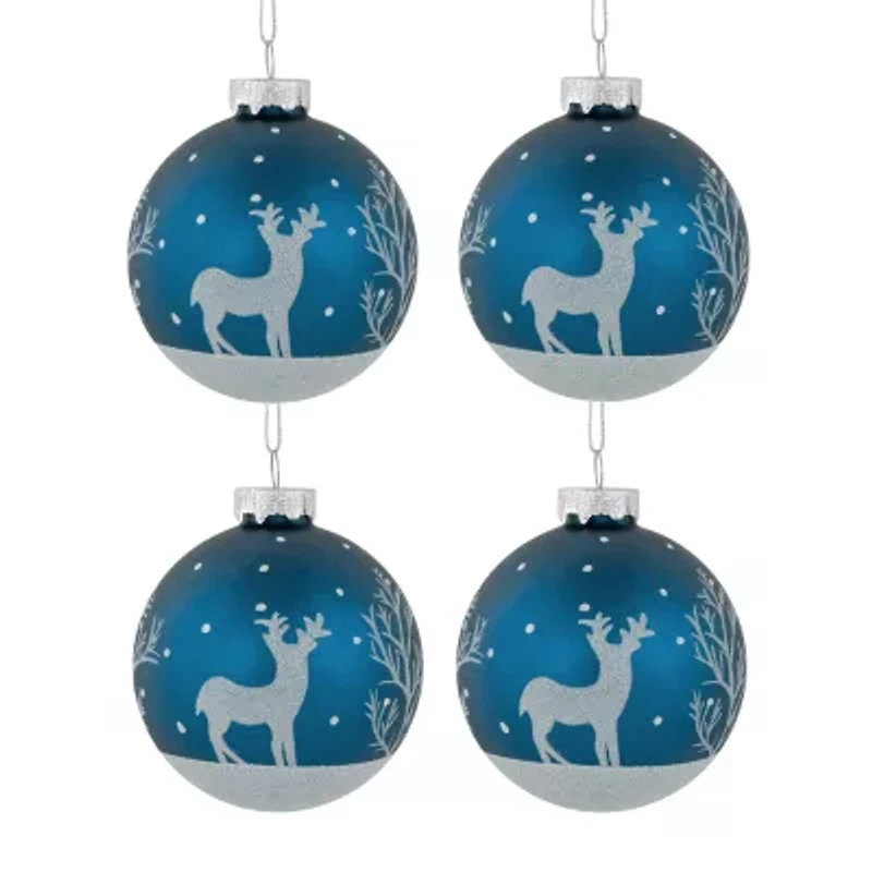 Add a touch of elegance and whimsy to your holiday decor with these blue glass Christmas ball ornaments. Each ornament is adorned with intricate glittery designs of a majestic reindeer adding a festive touch to your Christmas tree or wreath. Perfect for creating a cozy and inviting atmosphere during the holiday season. These timeless ornaments are sure to become cherished keepsakes that will be treasured for years to come. Product features: blue and white glittered glass ball ornament. Accented with a white glitter reindeer and tree on snow-covered ground. 4-piece set. Color: royal blue. Finish: matte. Balls are equipped with silver ornament caps. Ornaments come ready-to-hang on silver cords. For indoor use only dimensions: 3" diameter (80mm). Material(s): glass