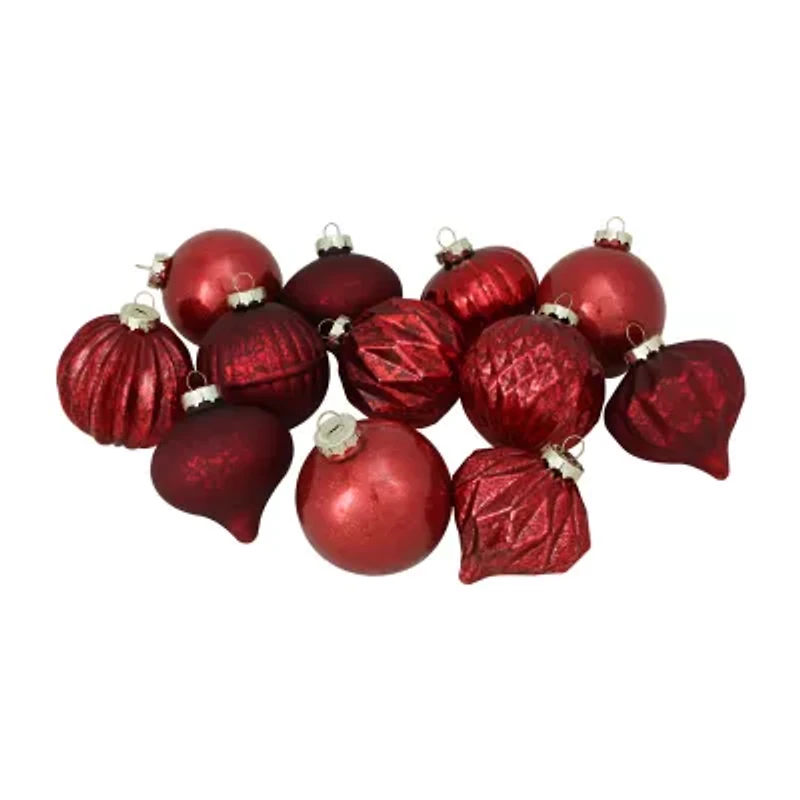 Give your holiday decor a touch of class and vintage flair with this beautiful set of glass ornaments. These ornaments come in mercury glass inspired and glitter drenched styles and will add a unique twist to your tree. These ornament sets are perfect for adding to your already existing set or to build a new collection. Product features: 12-piece set. Color(s): red. Comes in 2 finishes: mercury style and glitter. Striped and diamond textured. Ornament come in onion and ball style.