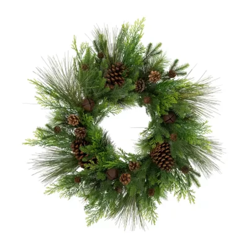 Add our Real Touch™ wreath to your door wall or window for a traditional touch to your holiday decor. This beautifully designed wreath combines the timeless charm of mixed pine and cedar adorned with rustic pinecones and cheerful jingle bells. The natural twig grapevine backing adds an authentic touch creating a perfect blend of tradition and elegance. Elevate your home this holiday season with a wreath that captures the essence of winter magic and welcomes all with a touch of seasonal splendor. Product Features: Real Touch™ artificial wreath. Unlit. 0 tips. 2" wide tapered tips. No assembly required - wreath comes in 1 piece. Includes a thick grapevine ring frame backing for hanging. Recommended for indoor use - if using outdoors place under a covered area. Dimensions: 26" diameter (measured from outermost tip/edge to outermost tip/edge across the wreath). Material(s): PE/PVC/twig. Note: Branches are compressed for shipment and need to be fluffed out upon arrival to look like the photo.