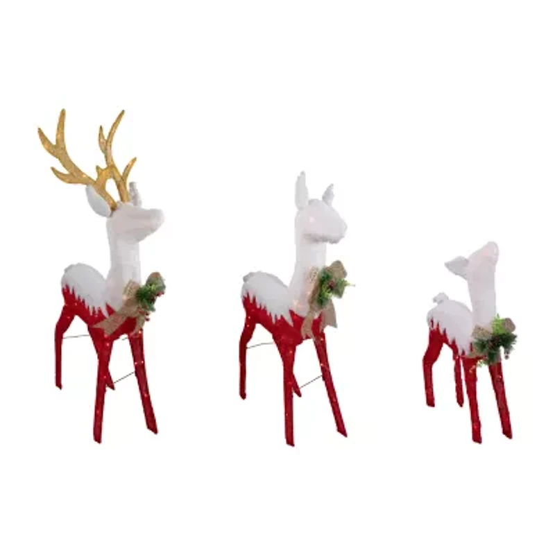 Everyone loves reindeer for their magic and beauty this beautifully crafted pre-lit reindeer family will add the perfect dose of sparkle to your holiday accented with iridescent glitter and gold bows with pine cones berries and pine needles they will be perfect for your porch lawn or anywhere you to add some holiday charm product features: lighted outdoor reindeer family decoration pre-lit with 180 clear lights bulb size: mini bulb type: incandescent 96" clear lead cord if one bulb burns out the rest will stay lit cannot be displayed separately comes with replacement bulbs and spare fuses some assembly required; ground stakes included ul approved and certified for indoor or outdoor use lights per reindeer: buck: 80 lights doe: 60 lights fawn: 40 lights dimensions: buck: 52.5"h x 35"w x 7"d doe: 45"h x 33"w x 7.5"d fawn: 29"h x 16"w x 6"d material(s): polyester/wire/plastic/metal set includes 1 of each item shown totaling 3