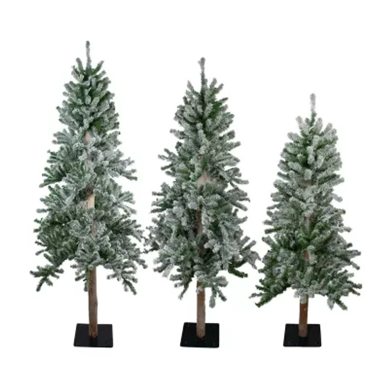 Celebrate a country Christmas with family and friends This season these rustic alpine trees are perfect for your holiday decor decorated with a light flocking these trees are sure to impress display plain or add ornaments for a bit of extra flair product features of the 4' tree: 337 branch tips no assembly required - tree comes in 1 piece 26" base diameter (widest point) medium profile tree product features of the 5' tree: 475 branch tips 2-piece easy assembly 28" base diameter (widest point) slim profile tree product features of the 6' tree: 655 branch tips 3-piece easy assembly 30" base diameter (widest point) slim profile tree features for all trees: unlit realistic wood trunk with attached metal base recommended for indoor use only material(s): pvc/metal/wood/wire set includes 1 of each item shown for a total of 3 items note: branches are compressed for shipment and need to be fluffed out upon arrival to look like the photo.