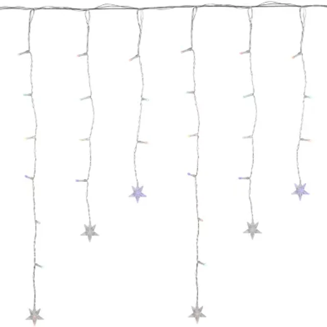 Transform your indoor or outdoor space into a dazzling winter wonderland with these icicle lights. These enchanting lights are the perfect way to bring holiday magic to your home. Adorned with wide-angle LED lights in a mesmerizing array of multi-color hues these lights will fill your surroundings with festive brilliance. Each icicle drop is elegantly finished with a charming star adding a touch of celestial charm to your holiday decor. Rest easy knowing that these lights are UL certified and approved for both indoor and outdoor use ensuring a safe and cheerful holiday season. Product Features: Color: multi-color/clear wire. Number of bulbs on string: 400. Bulb size: wide angle. Bulb type: LED. Drop lengths alternate between 18.25" and 30" long. Spacing between each bulb: 4". Spacing between each drop: 4.75". Lighted length: 29.5'. Total length: 33.75'. 5" tail cord. 16.25' lead cord. Additional Product Features: Super bright bulbs. UL certified and approved for indoor or outdoor use. If one bulb burns out the rest will stay lit. For indoor or outdoor use. Contains end to end connector which allows you to stack multiple sets together (not more than 3 sets). 120 volts 60 hertz 0.20 amps 1.9 watts. Dimensions: String: 33.75' long. Stars: 1.5" high x 1.75" wide. Material(s): plastic/glass bulbs/wire