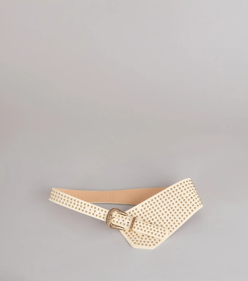 Outfit feeling a little too safe? This statement belt fixes that instantly. The bold shape and all-over studs bring just enough attitude to elevate your look for festivals, concerts, or everyday. Fit & Features Faux leather material Asymmetrical wide belt silhouette Studded design throughout Western-inspired buckle closure