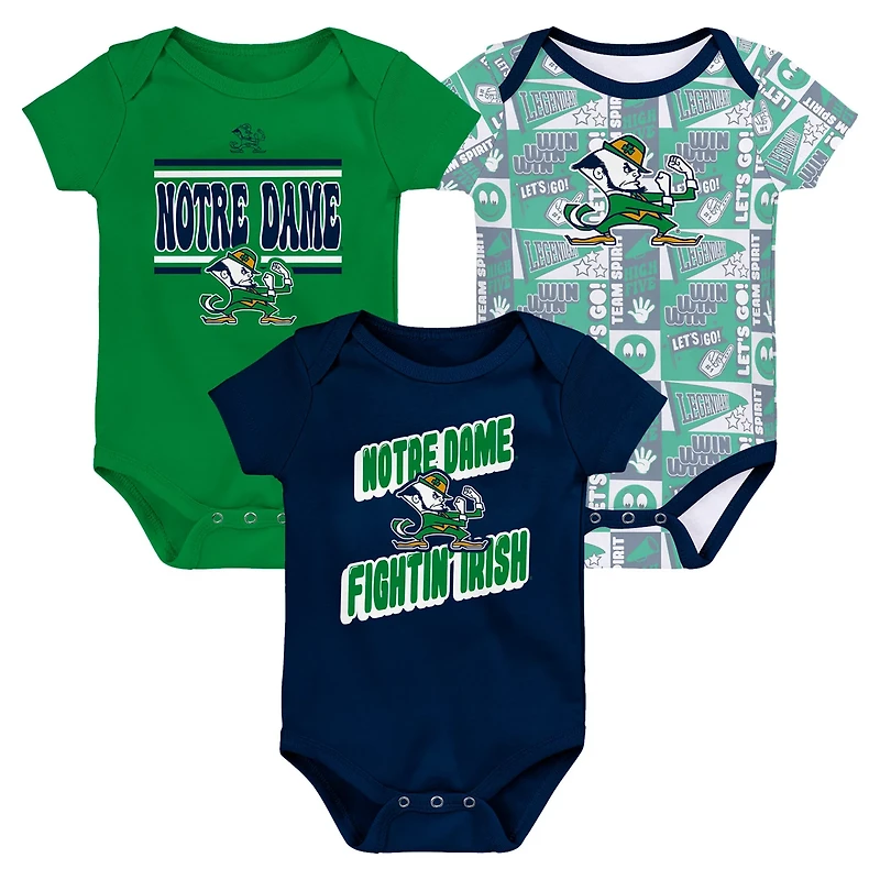 Give the newest Notre Dame Fighting Irish fan in your life some team spirit with this Sunday Comics 3-Pack Bodysuit Set The soft cotton fabric and convenient snap closures make dressing your little one a breeze This adorable bodysuit set is the perfect way to share your Notre Dame Fighting Irish pride with the newest member of the family