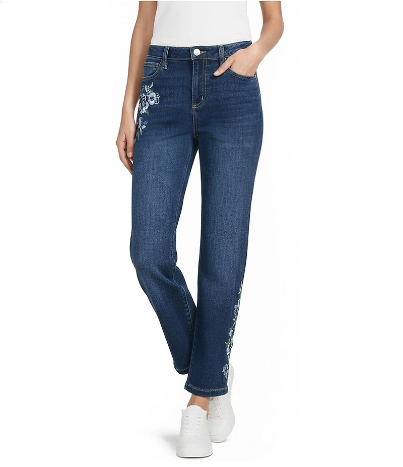 Nurture Petite Mid Rise Embroidered Straight Ankle Jeans