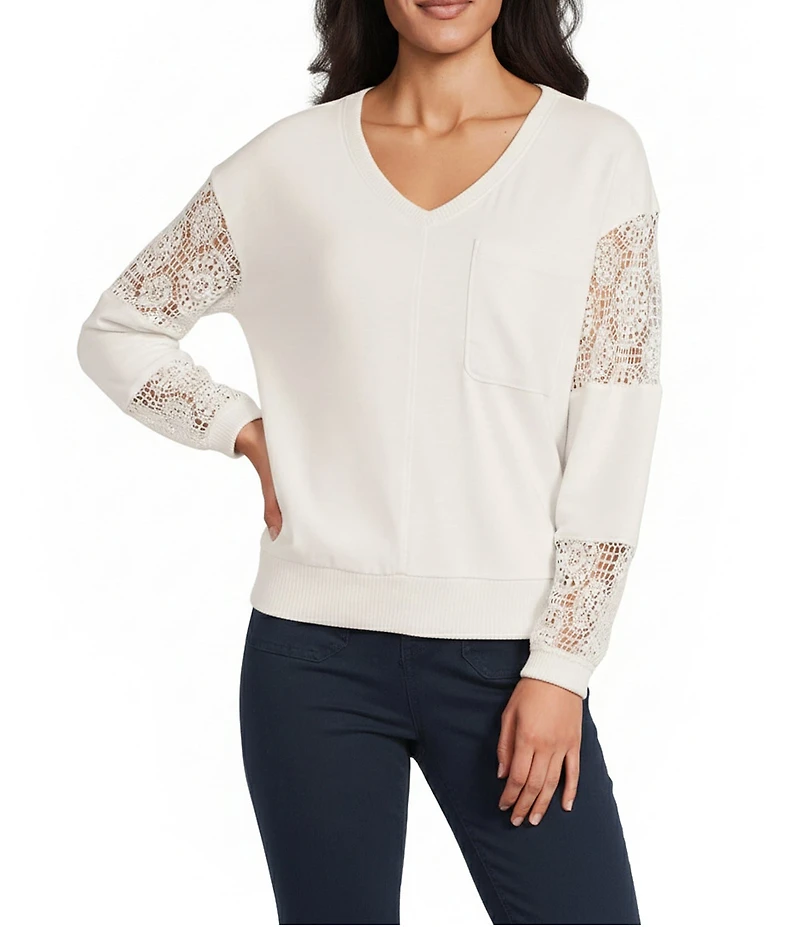 Nurture Solid V-Neck Long Sleeve Drop Shoulder French Terry Knit Lace Detail Ribbed Pullover