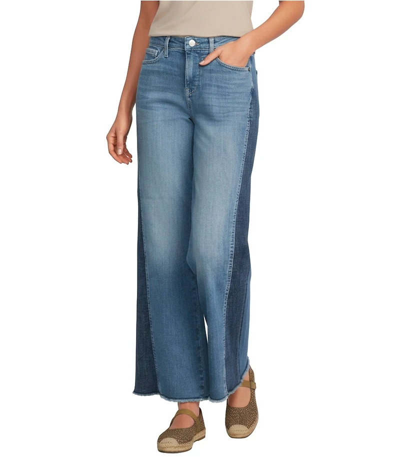 From NYDJ, these jeans feature: Stretch denim fabrication Lift Tuck® Technology Wide leg silhouette Belt loops 5-pocket styling Contrast side panel Frayed hemline Front button and zipper closure Approx. 29" inseam Cotton/lycra/elastane Machine wash Imported.