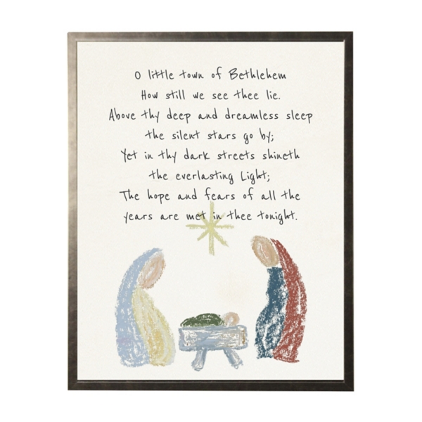 Remember the reason for the season with this O Little Town of Bethlehem Framed Print. Its beautiful style will add a warm, sentimental touch to your home this Christmas! Framed print measures 13L x 1W x 17H in. Frame crafted of pewter Black frame finish Features the nativity scene with "O' Little Town of Bethlehem" lyrics Mounted on board Hues of white, black, blue, yellow, red, and tan Weight: 3 lbs. Hangs from back-mounted hardware Care: Dust with a soft, dry cloth. This item is available at Kirklands.com only, not available in stores. Please note: this item cannot be shipped to APO/FPO addresses.