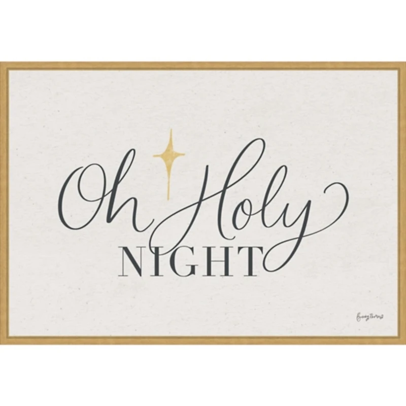 Remember to keep the faith all Christmas long with this Oh Holy Night Framed Canvas Art Print. Detailed with a simplistic star, this wall quote creates a peaceful feeling in a home. Overall dimensions Width: 33 in. Depth: 1.5 in. Height: 23 in. Gold frame finish Distinctively printed on stretched canvas Plastic frame around wrapped canvas Features the text "Oh Holy Night" Hues of white, gray, and gold Artist: Becky Thorns Weight: 3 lbs. Hangs from back-mounted hardware Care: Dust with a soft, dry cloth. This item is available at Kirklands.com only, not available in stores. Please note: this item cannot be shipped to APO/FPO addresses.
