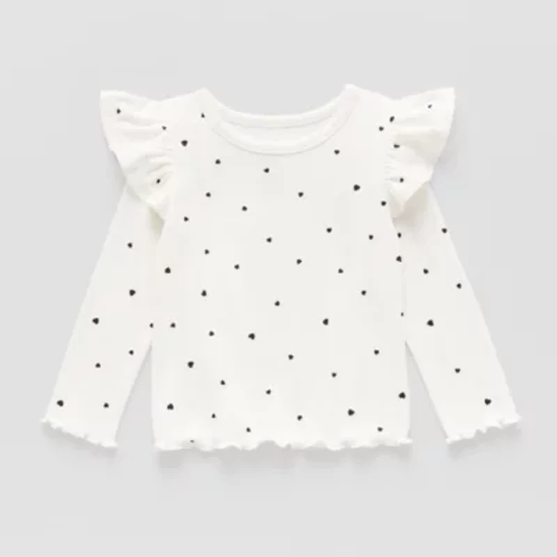 This Okie Dokie baby girl's t-shirt is a super cute heart-print style you'll love seeing her in everyday. Made from soft stretch-knit, this pullover long-sleeve top has a round neckline, lettuce trims and ruffled panels on the shoulders. Wear it with leggings or shorts.