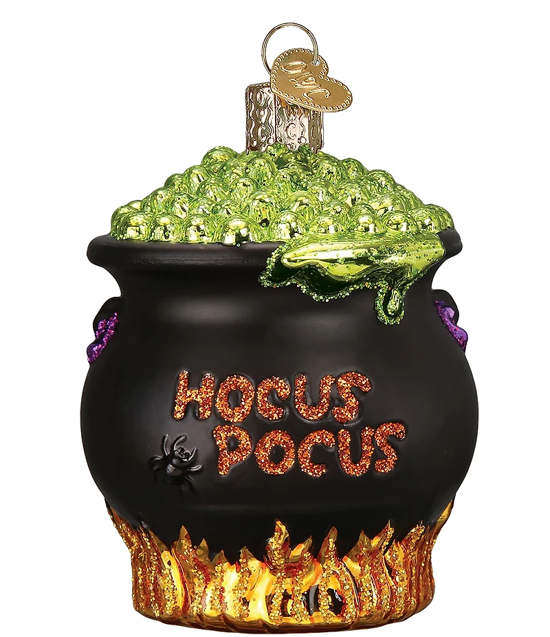 From Old World Christmas, this ornament features: What is brewing in the Halloween cauldron? Could it be a magic love potion, a truth serum, or possibly even a concoction to turn a prince into a frog? Each time you hang the Halloween Cauldron ornament, take a guess at what the witch is brewing. "Hocus Pocus" wording  Handcrafted Exceptional color and vibrance Hand- painted and Glittered Heart depicts OWC Trademark logo  Approx. 3.25 x 2.5 x 2.5 (HxLxW) Crafted of glass Ships in safe packaging with a keepsake box to store for years to come. Store in a cool, dry place when not in use. Imported.