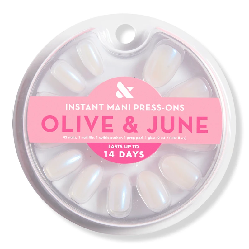 INSTANT MANI PINK GOLDFISH. Features: A shimmery pink iridescent in a medium oval shape.. Benefits: Realest-looking fake nails. Lasts up to 14 days. Non-damaging glue. Your best, realest-looking fit. More sizes than any brand. Made with 94% recycled materials. Includes: 42 nails, 1 nail file, 1 cuticle pusher, 1 prep pad, 1 glue.