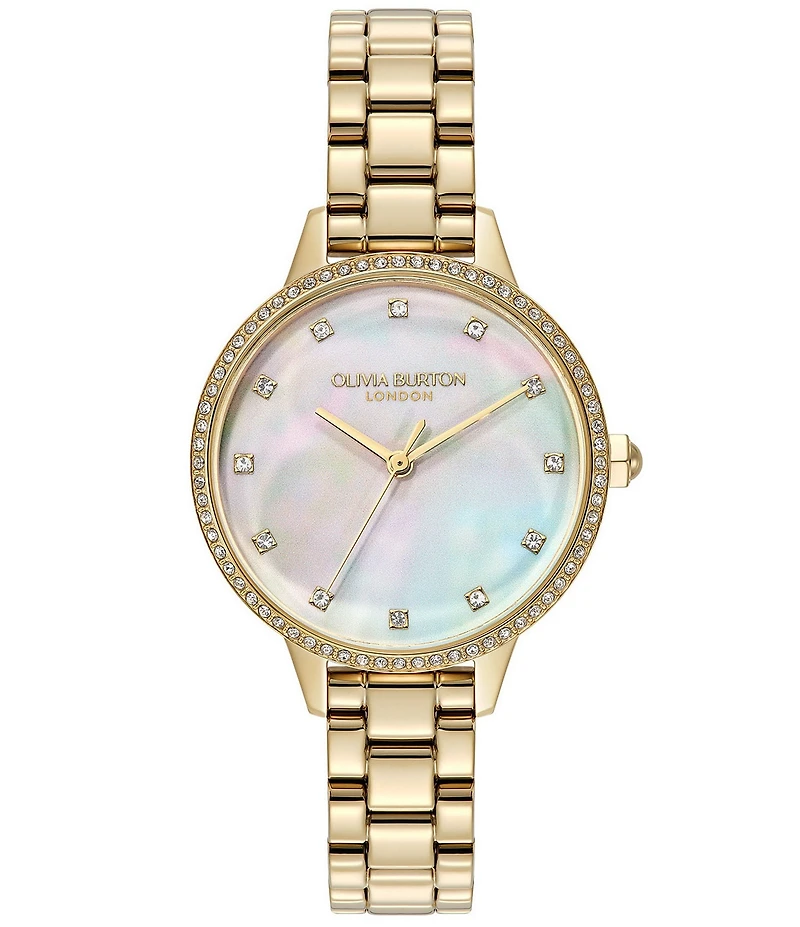 From Olivia Burton, this women's watch features: Gold tone stainless steel bracelet and case Pearlized pastel dial Link/clasp closure Quartz analog movement Case diameter approx. 34mm Water resistance: 3B Imported.