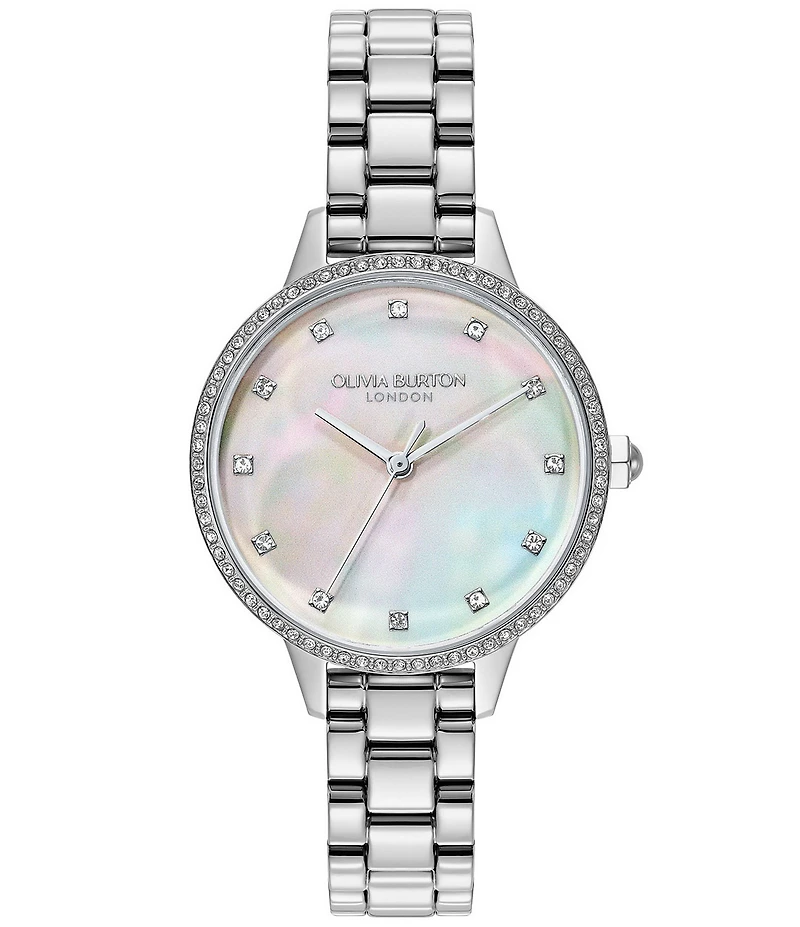 From Olivia Burton, this women's watch features: Stainless steel bracelet and case Pearlized pastel dial Link/clasp closure Quartz analog movement Case diameter approx. 34mm Water resistance: 3B Imported.